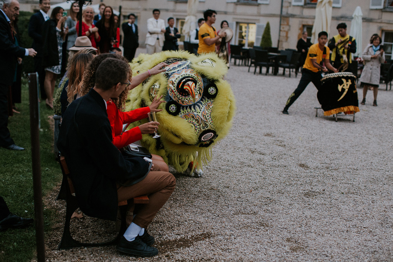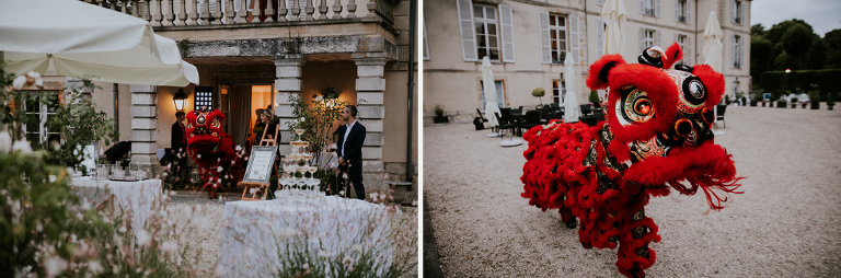 The ceremony itself started in a nice church in Chantilly with a female pastor. Then we all moved to Chateau d’Aveny for the reception. The cocktail hour was spiced up by a dragon dance, which was probably the nicest performance I had ever seen on a wedding day.